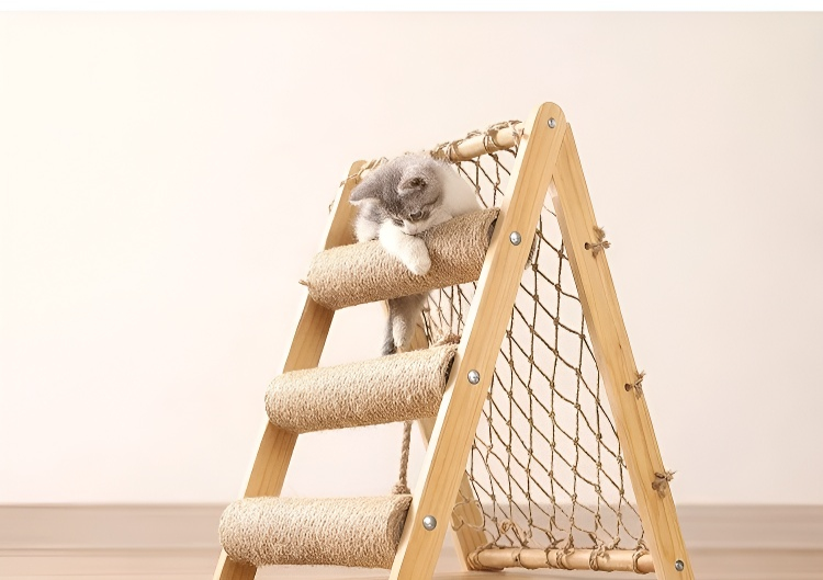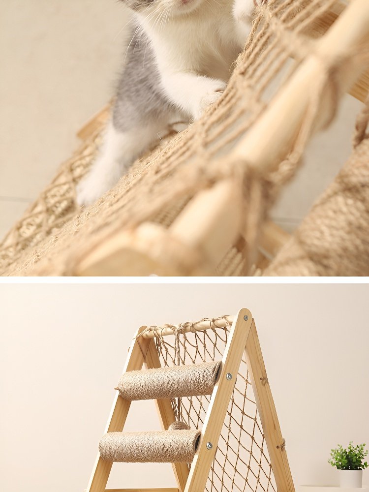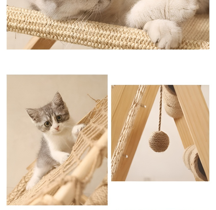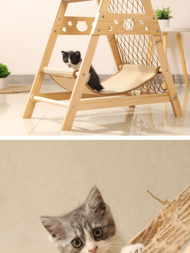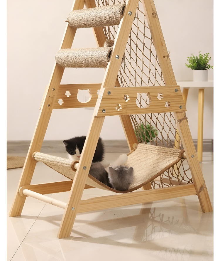 Multifunkciós tömörfa macskabútor, kaparódeszka és függőágy szett